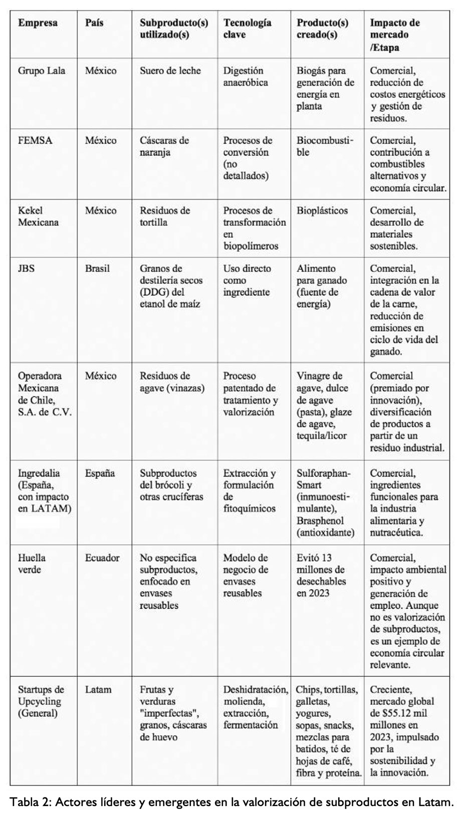 - Casos de éxito: ya existen ejemplos concretos en la región: Grupo Lala transforma el suero de leche en biogás, FEMSA utiliza cáscaras de naranja para producir biocombustible y Kekel Mexicana procesa residuos de tortilla en bioplásticos, todos en México. JBS en Brasil utiliza granos de destilería secos (DDG) del etanol de maíz para la alimentación animal. A nivel global, el capital de riesgo muestra un interés creciente en el "Upcycling Waste to Value" (Revalorizando el desperdicio hacia el valor).
